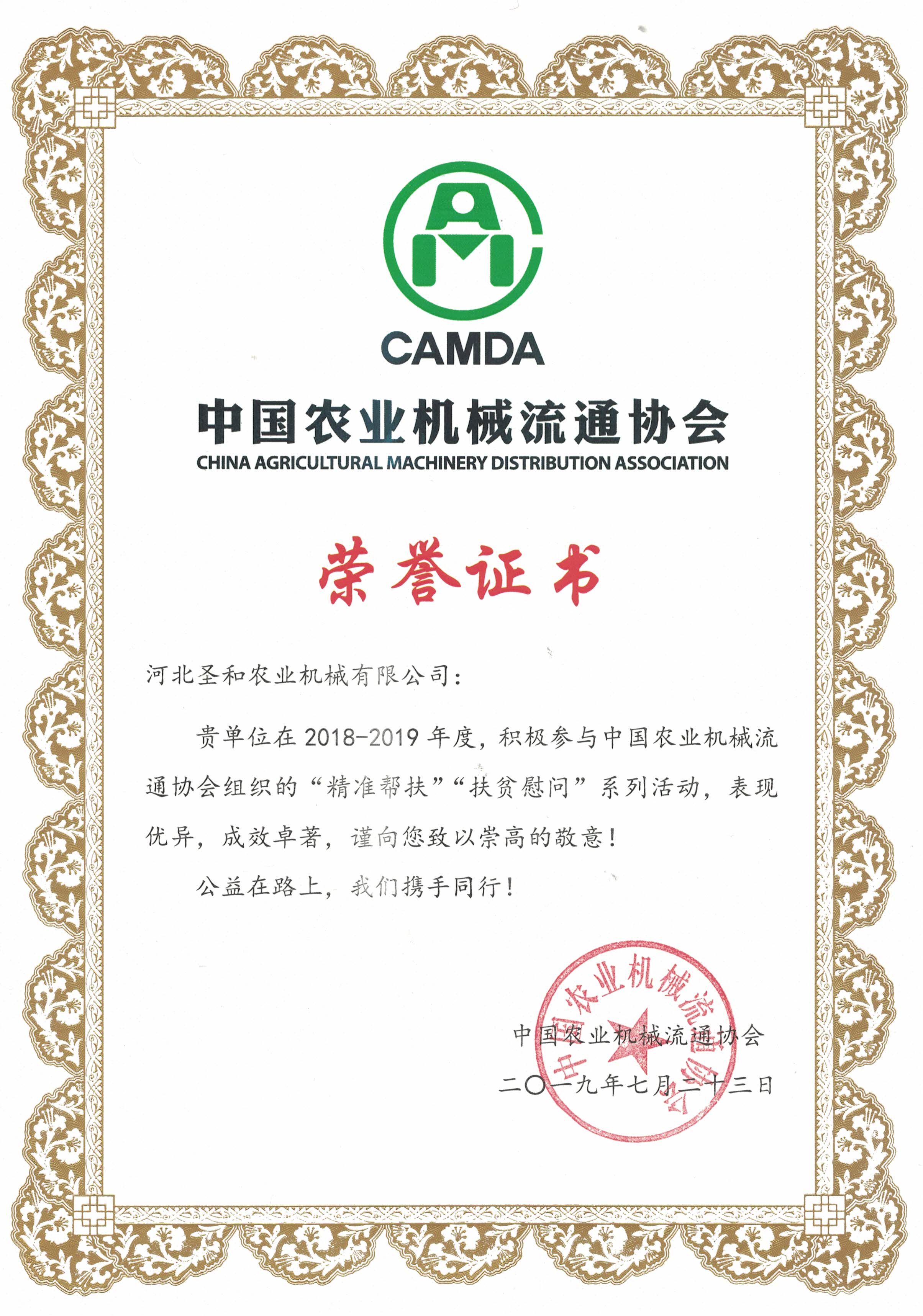 中國農(nóng)業(yè)機械流通協(xié)會榮譽證書
